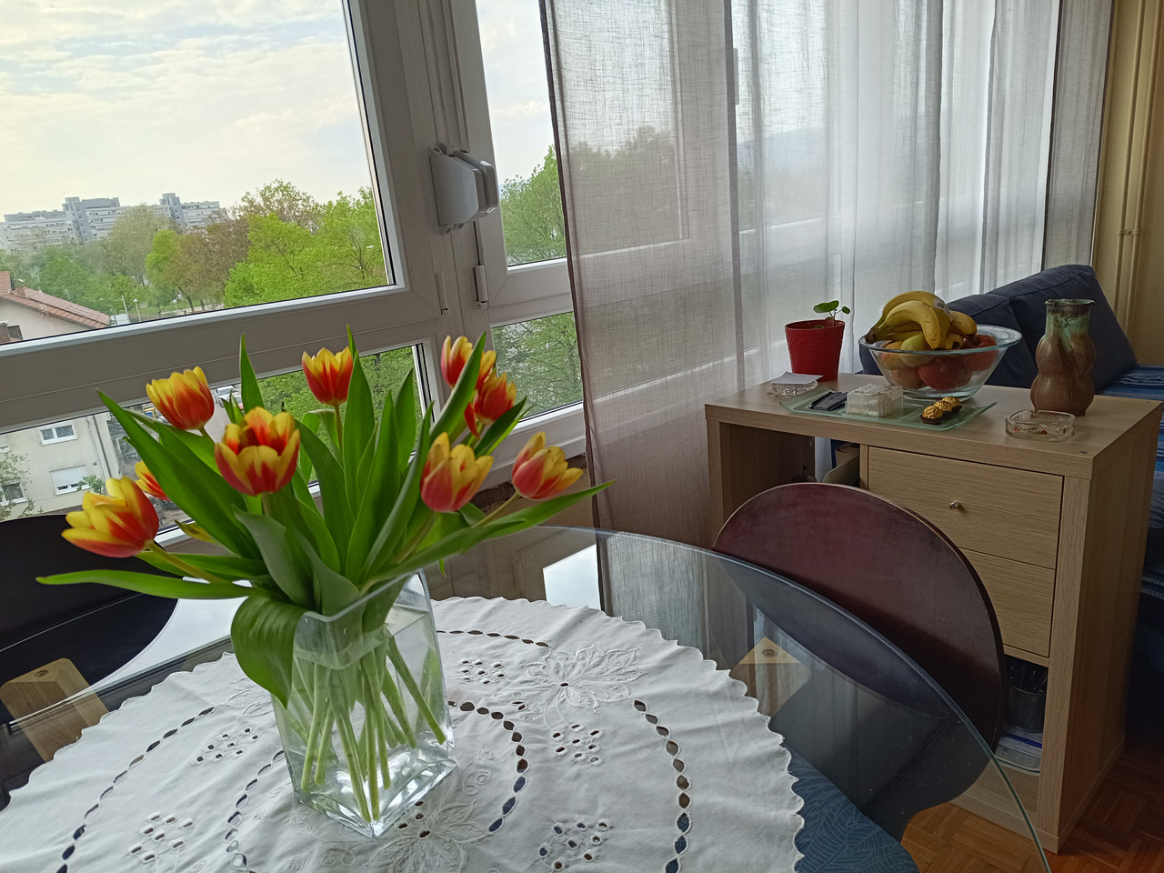 sada konačno imam prazan stol na kojem je prije uvijek bilo svašta (od soljenki, pepeljara, ubrusa, lijekova i sl)...sada samo tulipančići od jučer! kak me samo razvesele svaki put kad ih pogledam! a pogled je i dalje jako dobar, dapače, ozelenjele sve te lipe i prekrasan je pogled kroz prozor!